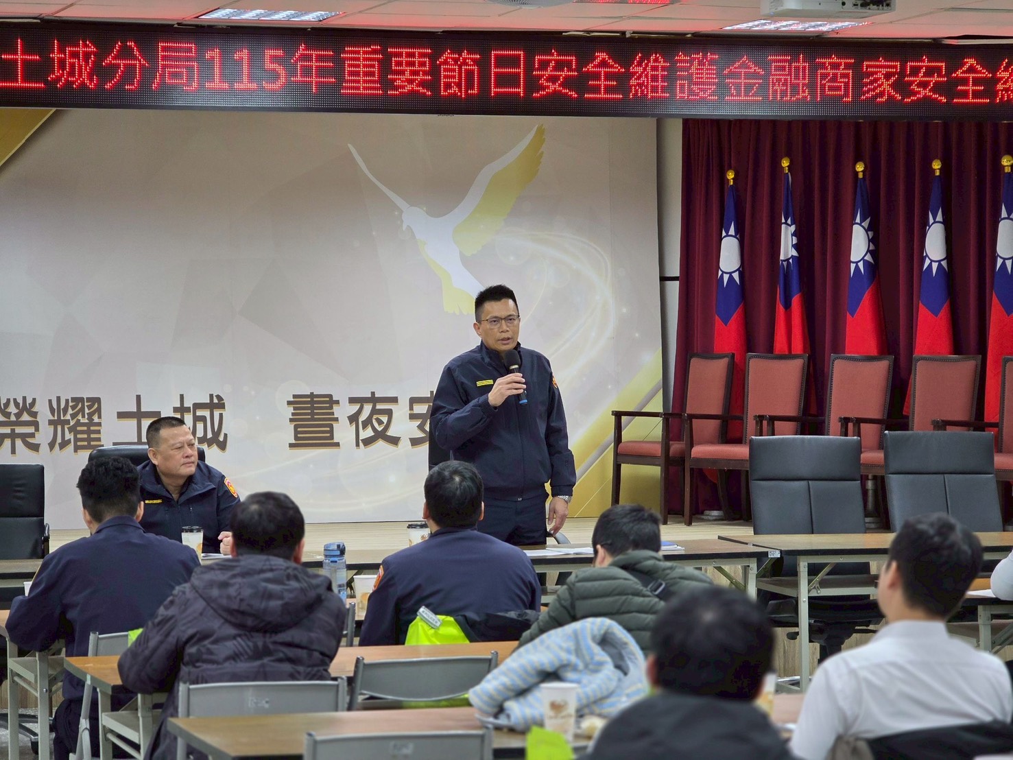 且為先期整備115年度加強重要節日安全維護工作「治安平穩」項目-金融機構安全維護工作案,以求農曆春節前治安平穩,對轄內24小時營業設有自動櫃員機(ATM)之四大超商(7-11、OK、全家、萊爾富),亦列為檢測對象,以提高商家遭強盜、搶奪、竊盜等危機意識,防患於未然。且要求自即日起至115年2月6日止,針對轄內「金融機構」、「金銀珠寶業」、「當舖業」、「加油站」、「超商」(以上場所稱金融商家)等營業場所,舉辦金融機構(商家)安全維護座談會,就防盜、防搶、防竊、預防犯罪宣導及補鈔、護鈔服務等議題雙向溝通,以提升金融商家安全維護觀念,為感謝行員的付出,土城分局長陳建龍特別頒贈「土城警察熊」致敬,肯定他們在第一線識破詐騙、守護民眾財產的辛勞,並鼓勵更多行員成為「防詐尖兵」,共同築起反詐防線。