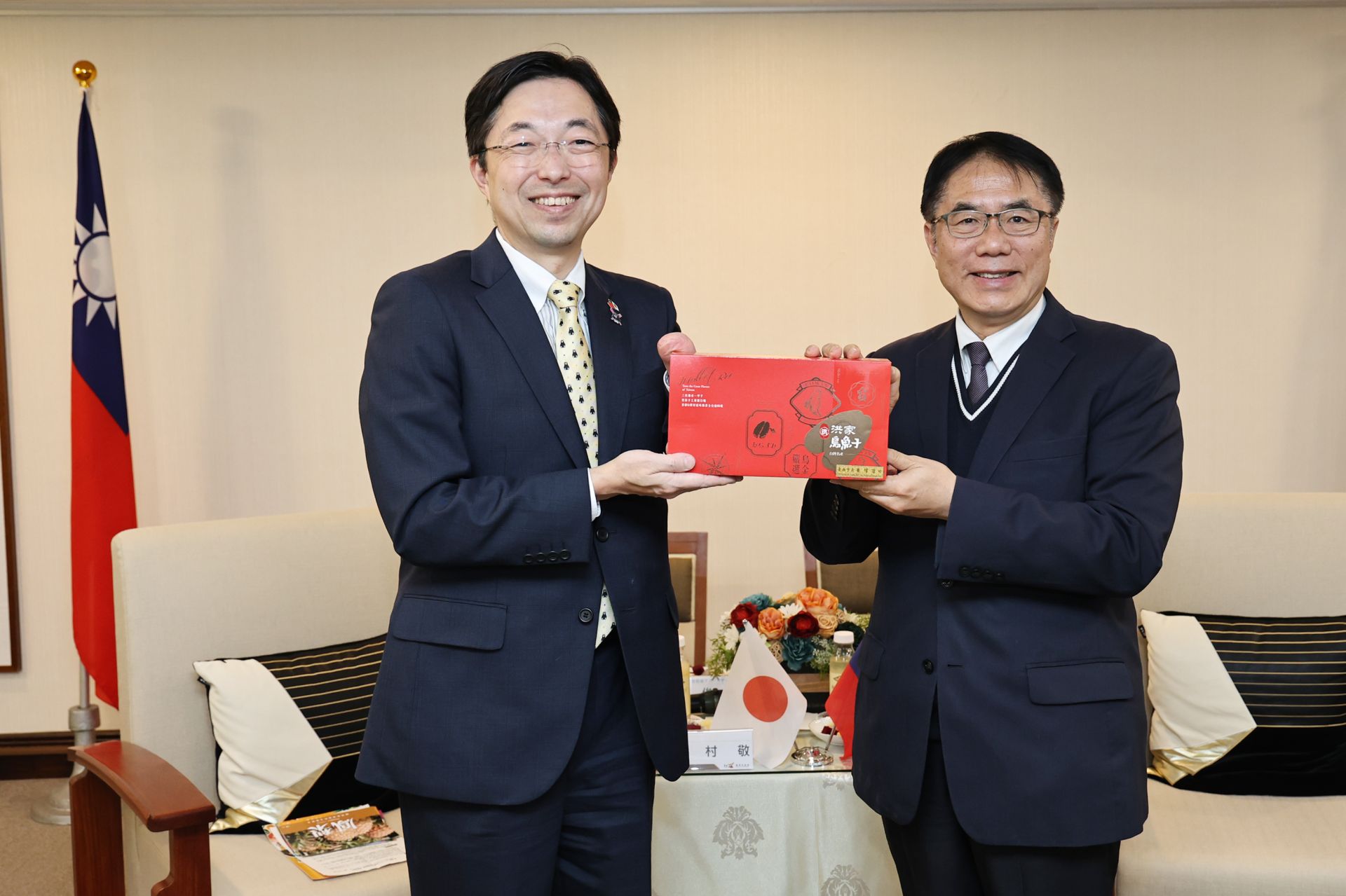 ▲市長黃偉哲致贈台南烏魚子禮盒給木村敬知事。(新聞處 提供)