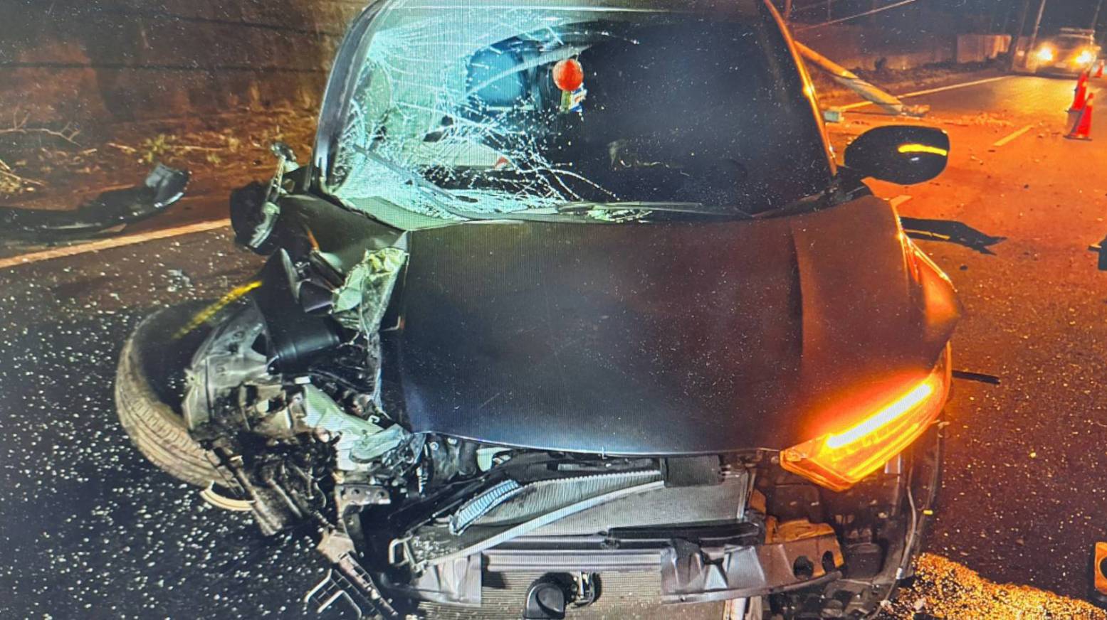 夜路一恍神釀禍!虎尾防汛道路轎車自撞電桿 現場一片狼藉