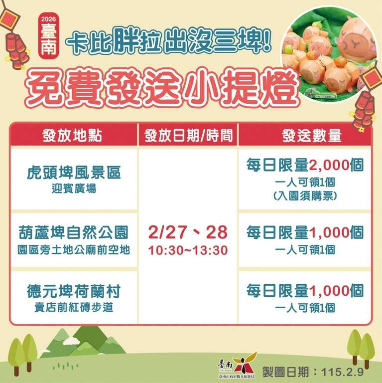 觀光旅遊局說明,延續去年吸引逾85萬人次參觀的卡比胖拉IP展熱潮,市府特別將網路票選人氣最高的「芒果午憩」打造為今年小提燈造型,並於2月27、28日每天上午10時30分至下午1時30分限時發送。提燈設計結合芒果、桔子與柚子等台南盛產水果,象徵「柚萌柚甜」、「大桔大利」、「光芒萬丈」,盼在傳遞新年祝福的同時行銷在地優質農產,展現台南自然慢活的旅遊節奏。