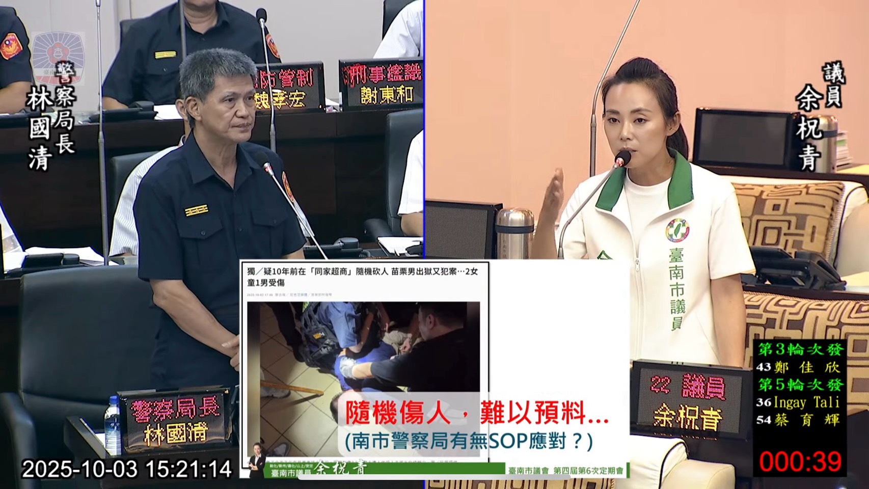 此外,針對社會上層出不窮的隨機傷人事件,余柷青指出,近日「苗栗男子持刀隨機砍人」再度引發社會憂慮,令人聯想到過去鄭捷捷運殺人、新北三峽汽車衝撞攻擊事件。她建議警察局應建立通報後的SOP,以降低遺憾發生,並加強隨機巡邏警力,發揮嚇阻效果。