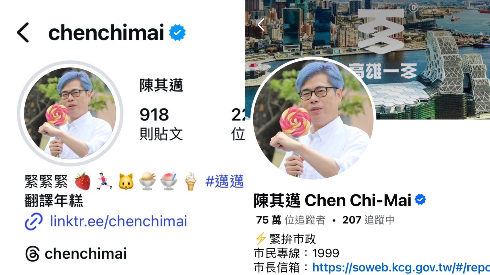 ▲陳其邁的社群大頭貼,頭髮已悄悄換上藍色,手持神似TWICE初代手燈的棒棒糖造型。(圖/翻攝畫面)